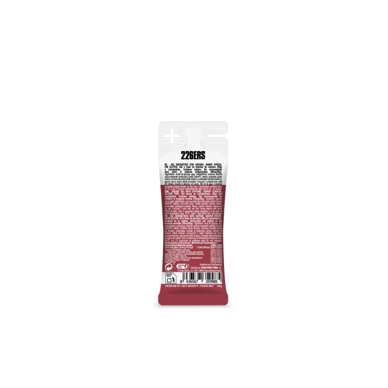 Gel energético con cafeína sabor cereza. Gel a base de Hidratos de carbono (50g/76gr; 30gr/45gr), ciclodextrina y aromas naturales. Contiene cafeína (160mg/76g; 95mg/45gr)). No recomendado para niños ni mujeres embarazadas.