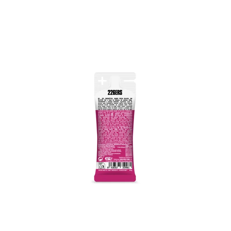 Gel energético sabor fresa salada. Gel a base de Hidratos de carbono (50g/76gr; 30gr/45gr), ciclodextrina y aromas naturales.